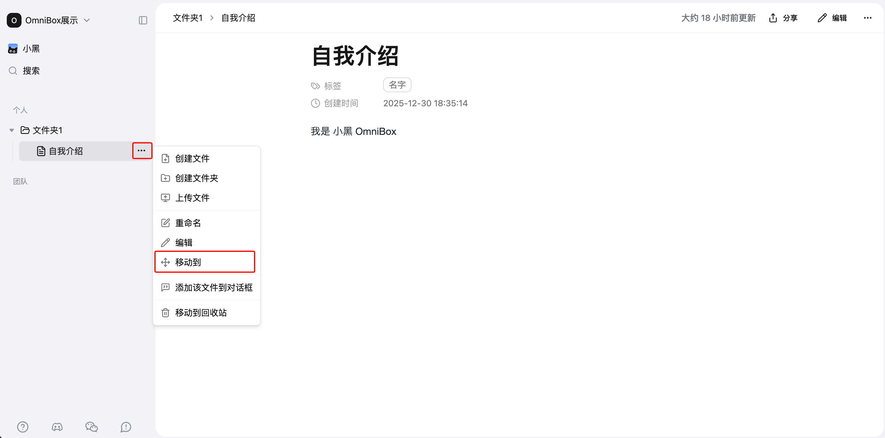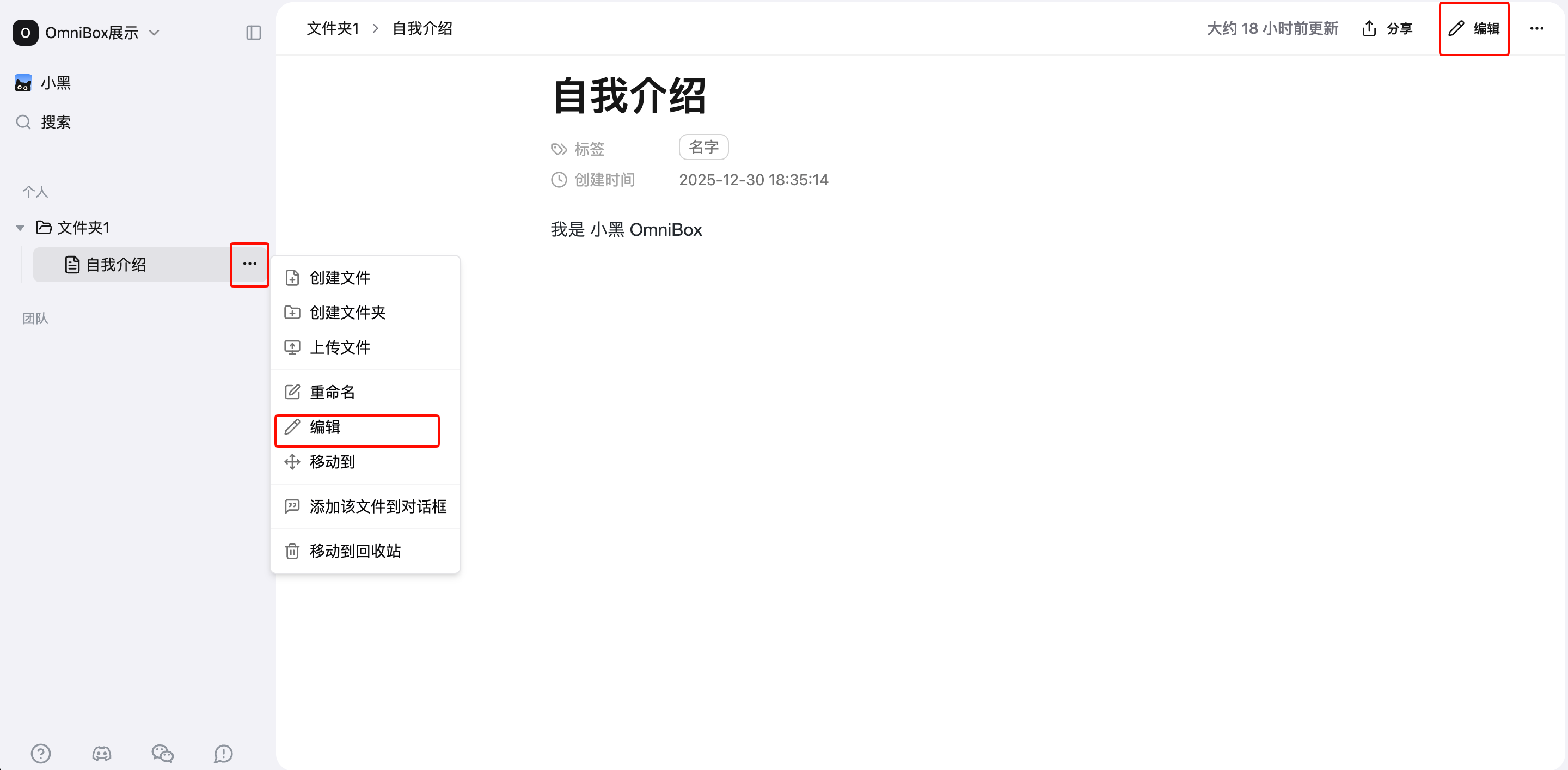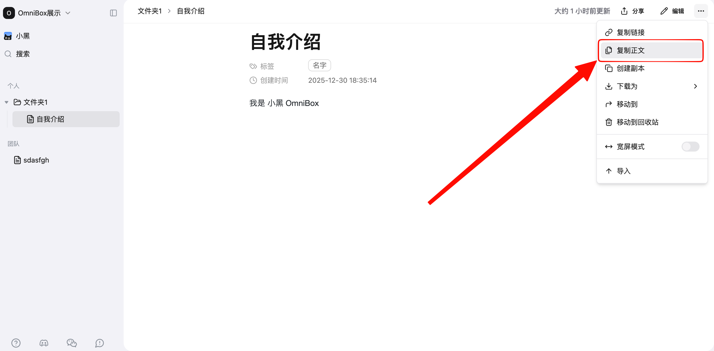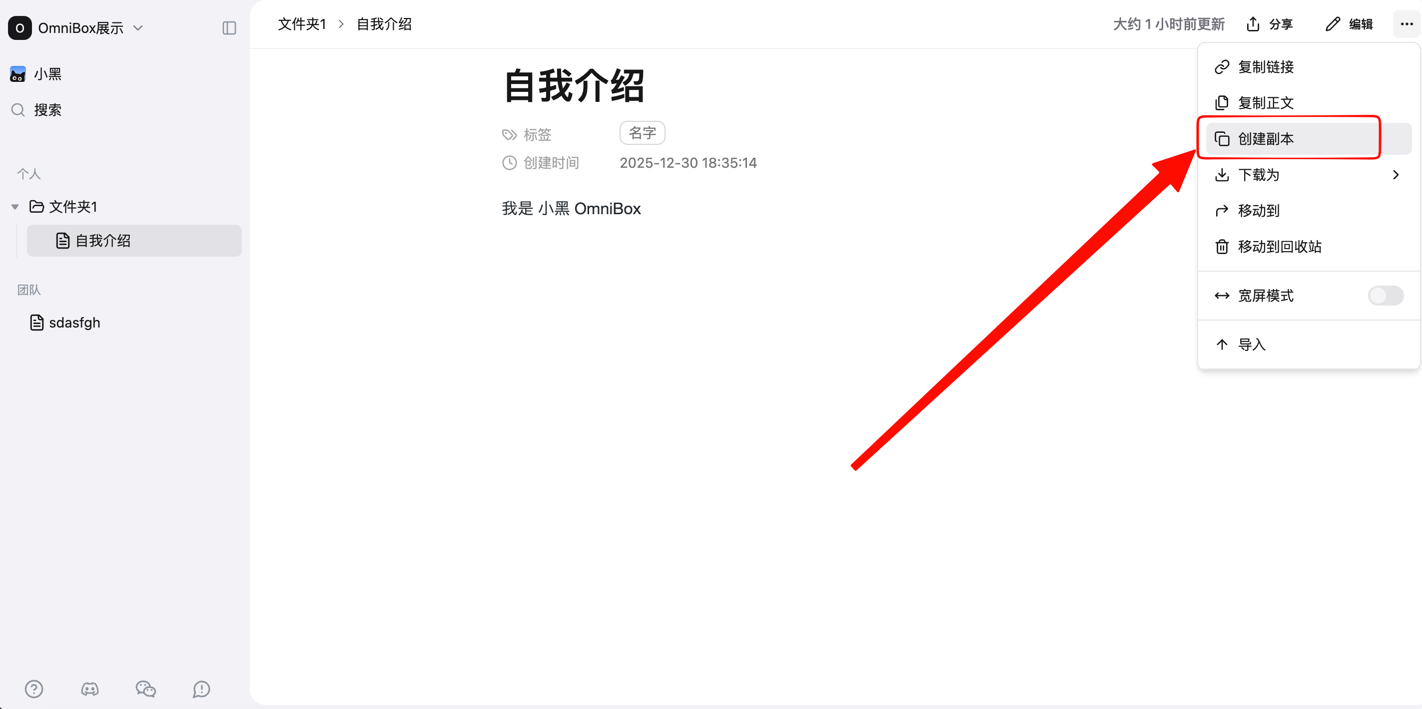 Open a file, click the menu in the top right corner, click Create a Copy to create a new file identical to the original in the knowledge base, named original filename(1).