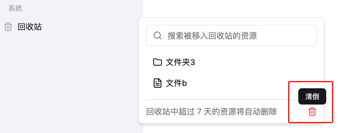 Trashto view all files/folders (including all files within the folders) that have been moved to the trash - Resources in the trash for more than 7 days will be automatically deleted