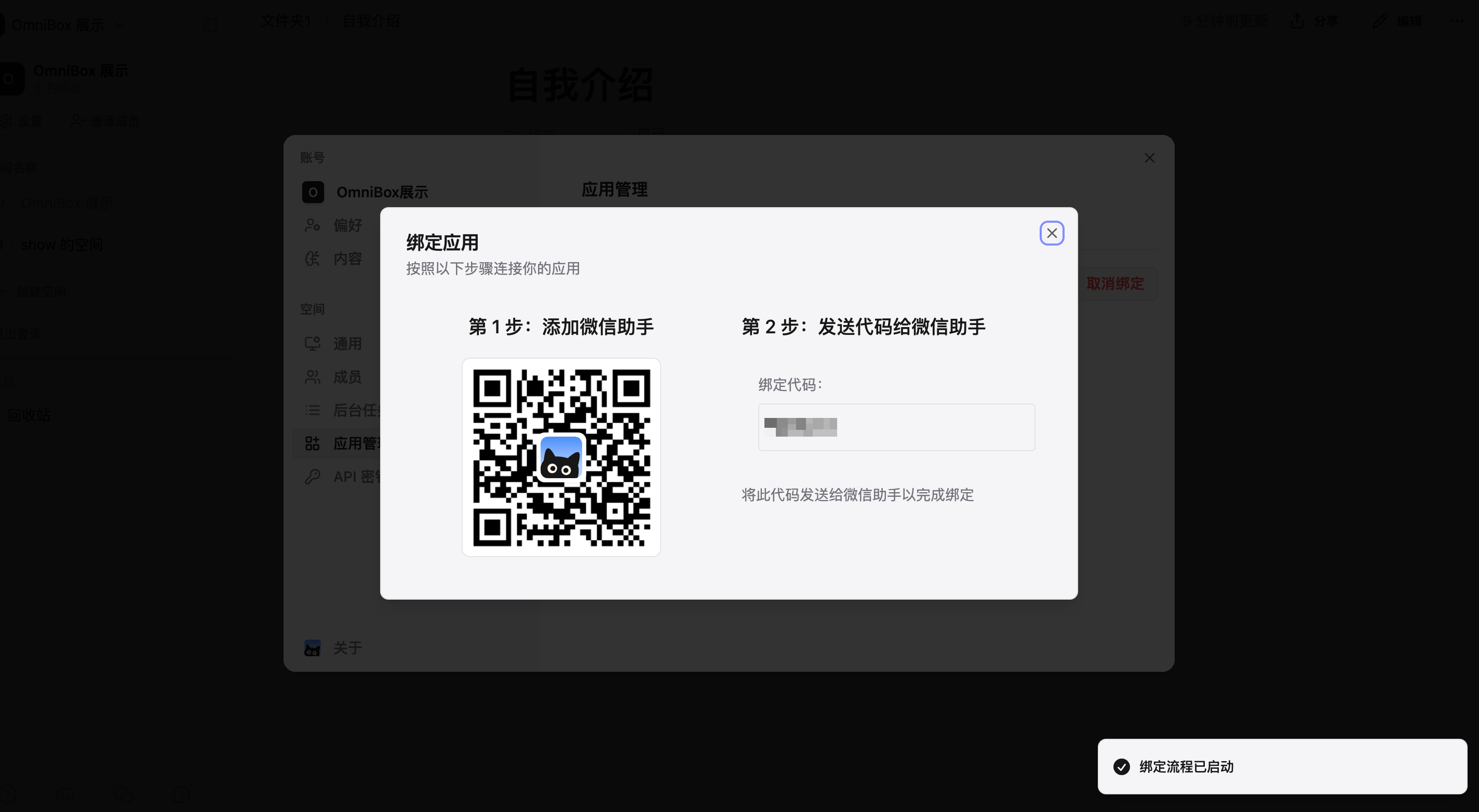 WeChat Assistant is currently bound to a space. To save WeChat Assistant information to a specific space, you need to unbind from the original space and rebind in the new space.