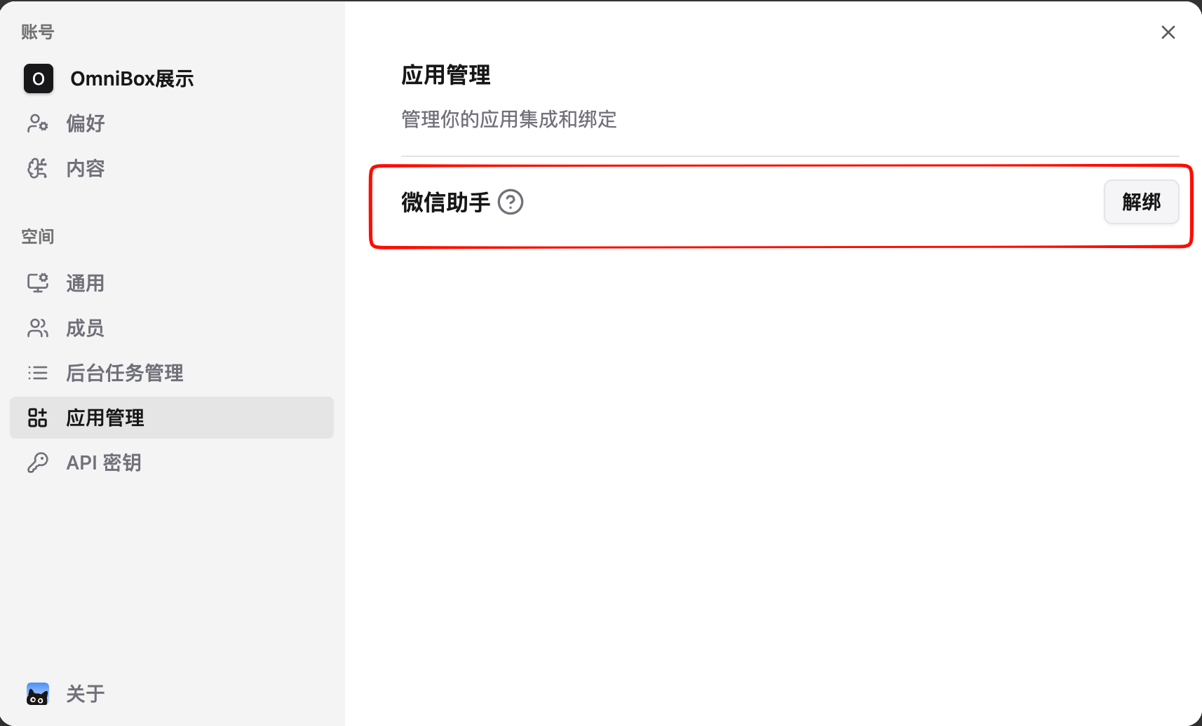 Settingsin the upper left corner, selectApp Management, and bind WeChat assistant