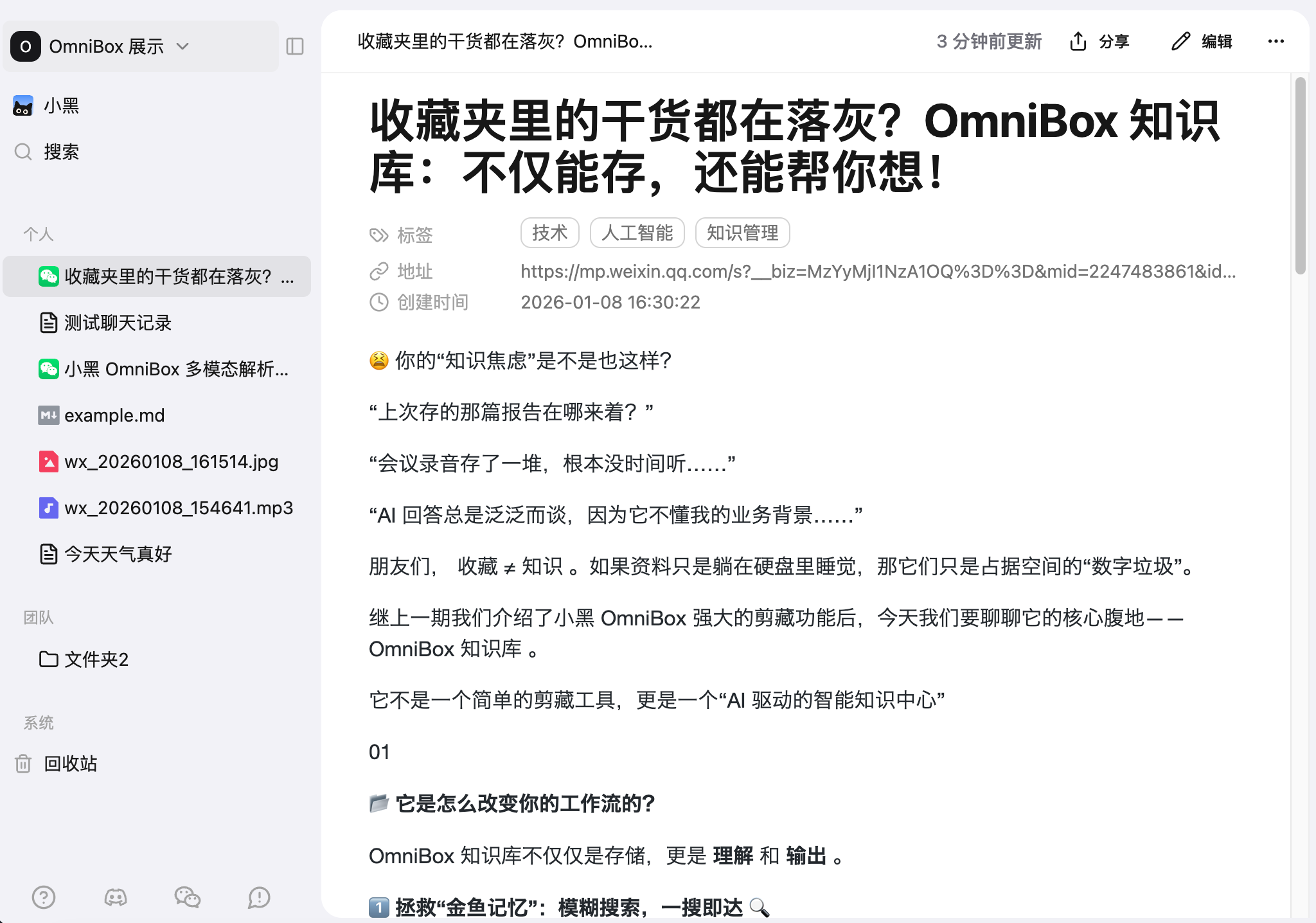 OmniBox Assistantin WeChat to save it. Supports direct forwarding, manual input, or local upload. - Saved content will be stored in Personal resource list by default