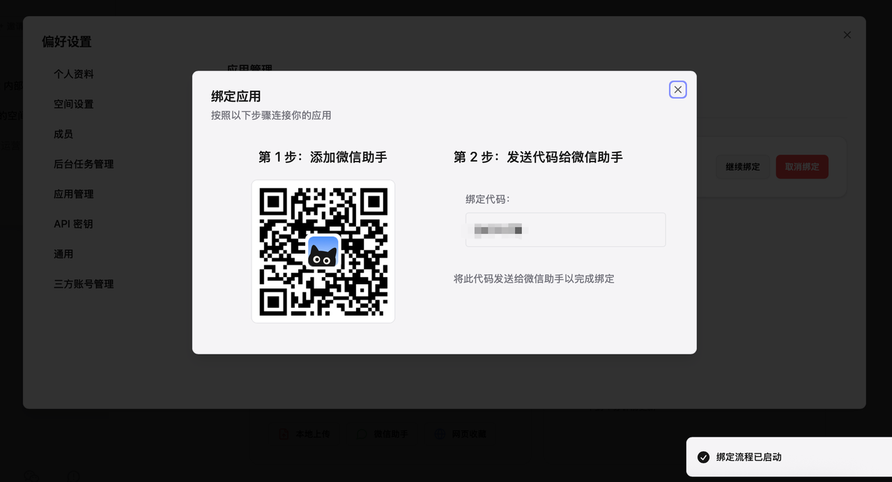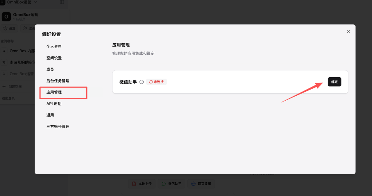 Settingsin the upper left corner, selectApp Management, and bind WeChat bot