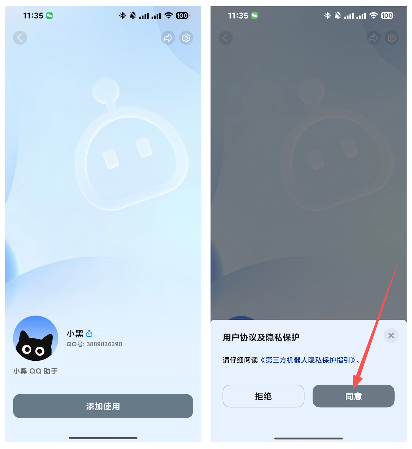 添加使用,并 点击同意用户协议及隐私保护,即可添加成功