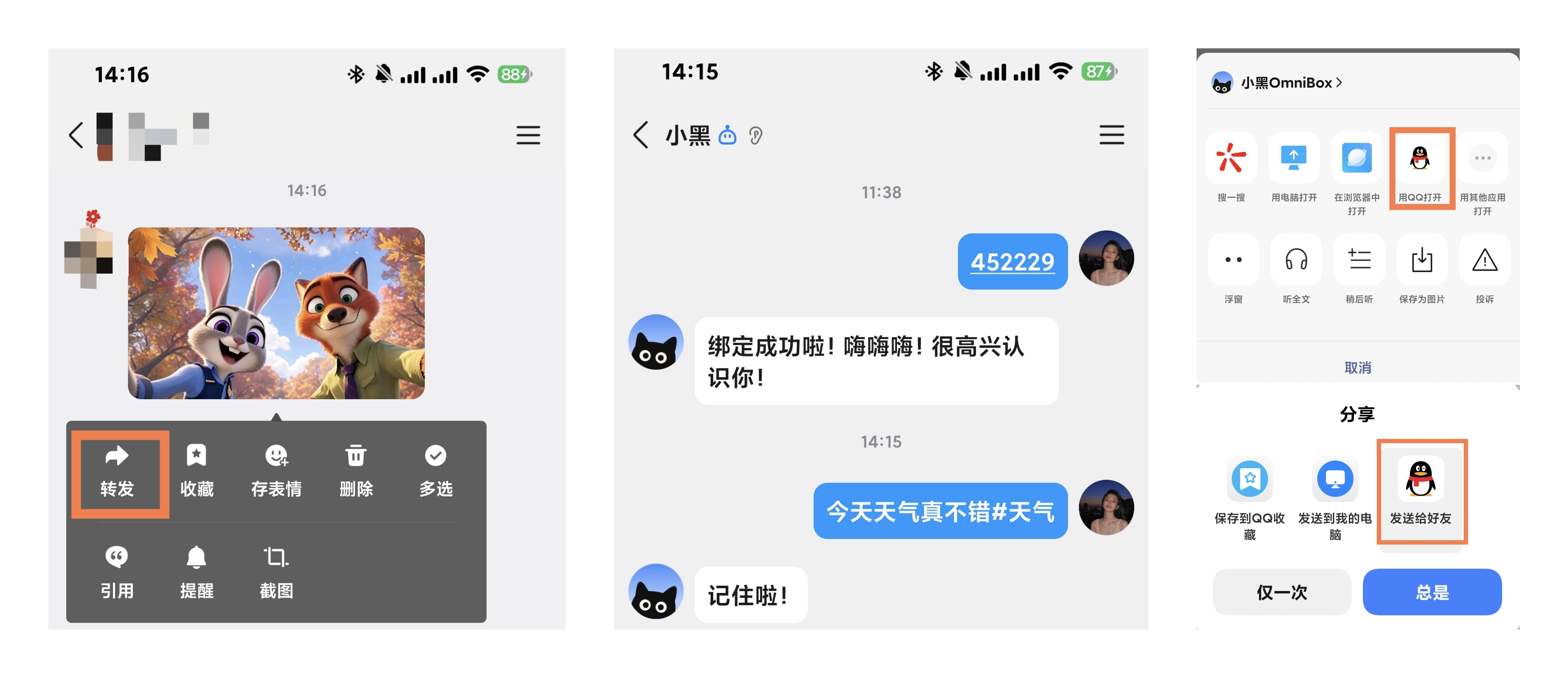 - 保存之后 QQ 助手会有对应的回复,保存的内容需要稍等片刻才会出现在您的 小黑 OmniBox 中